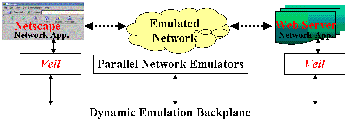 We use a dynamic loading approach to address this problem. When an application is executed, we use a certain combination of features of the runtime loader and the dynamic linker to transparently intercept and re-direct calls to the appropriate system calls at runtime. For this, we have developed a new library that duplicates the function signatures of the system calls. The runtime loader is made to pre-load this library before the application starts, which, in effect, makes our library override the default system libraries from the application’s point of view. When the application invokes the system calls, our library routines get invoked instead. This provides us complete control over the timing and content of the network data delivered to and from the application. Our library in turn uses the actual system library calls for its internal operation involving network communication with the parallel emulation backplane. This powerful mechanism allows us to run unmodified, pre-compiled applications over any virtual network of choice that is emulated using our emulation backplane. This permits us, for example, to evaluate the performance of existing unmodified applications over new network configurations that do not physically exist. |