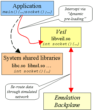 In order to control an application’s network activity to be able to re-route its traffic through the emulated network (as opposed to through the physical network), it is necessary to intercept its network system calls and redirect the application data to the emulated network via the Dynamic Backplane. Lack of source code of an application, and/or high complexity of source code, makes it challenging to intercept the application’s network activity. To this end, we have developed a powerful mechanism for transparently intercepting the standard system calls that an application uses for network activity. This mechanism is capable of intercepting system calls made even by pre-compiled applications whose source code is unavailable.
