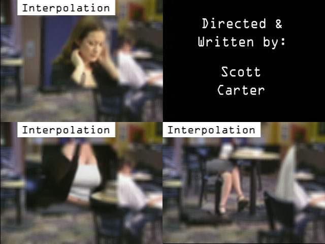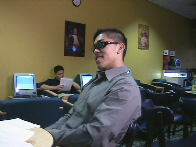 The effect used in this production uses multiple cameras focussed on an object/area. A program I coded interpolates between synchronized frames from the various cameras to produce/simulate a high quality digital zoom. The screenshot above is the effect combined with a very fudged version of "the Matrix effect" (view morphing). More technical details can be found here. The Key PeopleDamie Bartley - This video also allowed me to showcase the amazing beauty of my friend Damie. Andy Yang - Another friend and the man lucky enough to be the object of Damie's affection. Larry Cheng - A friend and group partner in producing this film as our resident audio mixing assistant, lunch-getter, and playing the role of "the loser" wearing yesterday's gear. Nezir Teke - Creator of all of the on-screen display effects and editing assistant. Also without his amazing computing hardware in the comfort of his apartment, we would have had to spend a lot of time doing the work in the computing lab. Scott Carter - The man behind the idea for this commercial. Also the