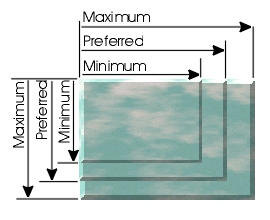 A View expresses the size that it would like to be in terms of three values, a minimum, a preferred, and a maximum span. Layout in a view is can be done independantly upon each axis. For a properly functioning View implementation, the minimum span will be <= the preferred span which in turn will be <= the maximum span.
