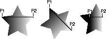 In the third star in Figure 2-8, both points lie within the shape. All of the points along the gradient line extending beyond P1 take the beginning color, and the points along the gradient line extending beyond P2 take the ending color.