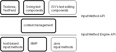 Likewise, the framework isolates text editing components from differences in various input method engines. In particular, it provides only one programming model for interacting with input methods. This lets developers write to a single input method API and users to choose whatever input method they prefer.