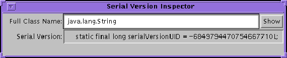 The programserialvercan be used to find out if a class is serializable and to get itsserialVersionUID. When invoked with the-show option, it puts up a simple user interface. To find out if a class is serializable and to find out itsserialVersionUID, enter its full class name, then press either the Enter or the Show button. The string printed can be copied and pasted into the evolved class.
