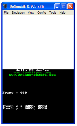 2.Open > Open ROM > select the C:\devKitPro\examples\nds\hello_world\hello_world.nds file that you just compiled.