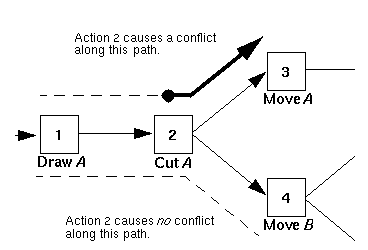 See Figure 2 for an example of such a conflict. It is possible that the insertion of the action will cause a conflict in one path, but not another. For this reason, all actions in all timelines passing through the insertion point are considered candidates for temporal conflicts. Because such conflicts are situated in the timeline itself, they corrupt the entire timeline they exist in, from the point of the earliest conflicting action. In the figure, the entire upper path from the point of insertion of the Cut operation is in an inconsistent state.