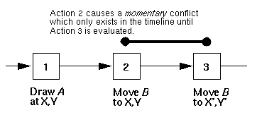 Figure 3 shows an example of such a conflict. Action 1 causes a figure to be drawn at coordinates X,Y . Action 2 moves a different figure to the same coordinates. This action causes a conflict to occur, based only on the state of the artifact up to the point of the insertion--by examining only upstream actions, the system can determine that two objects are in the same position. Further, note that such momentary conflict exist only for a bounded span of a timeline. Action 3 moves the second figure to a new, non-conflicting location. Thus, unlike temporal conflicts in which an entire timeline is corrupted, momentary conflicts are confined to a limited area of a timeline.