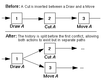 Figure 4 shows such an example, where an inserted Cut operation would conflict with a downstream Move. The history is forked into two branches. The first branch "favors" the Cut by letting it stand and removing its conflicting partner, the Move. The second branch does the opposite: the Move is favored and the Cut is deleted.