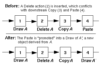 In the figure, promotion is used to replace the Paste operation, which depends on the existence of upstream actions, into a "stand-alone" Draw operation that has no such dependencies. In effect, the dependency is severed and the conflict is undone.