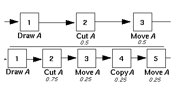 Figure 6 shows an example of quantum uncertainty. Here, we see our by-now classic Draw-Cut-Move inconsistency. After the insertion of the Cut, both the Cut and Move operations have uncertainty values of 0.5 indicating that they are equally uncertain. In the second graph shown, a sequence of Moves and Copies of the supposedly-cut object are appended to the timeline. These actions all "ignore" the interpretation of the conflict that favors the Cut operation, so they lessen the uncertainty of the Move, and all other actions that conflict with the Cut, at the expense of the Cut. In effect, these later operations reinforce the interpretation that the Cut should be ignored. Other divergent paths may favor the Cut, in which case the situation would be reversed in those paths.
