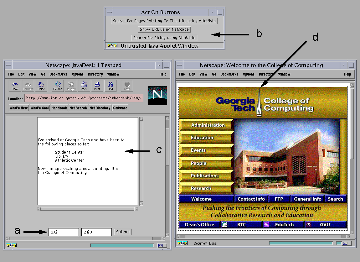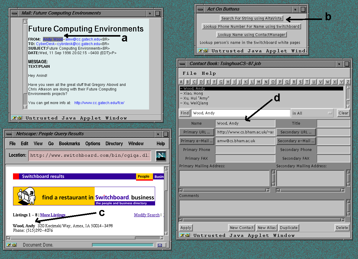 Figure 1: Screenshot: knowledge of the user's applications and data beting used with CyberDesk. The user selects the string "Andy Wood" in the e-mail tool (a). CyberDesk offers some suggestions (b): search using Altavista, look up a phone number using Switchboard (c), and look up the name in the contact manager (d).