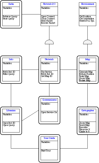 Many different functions are performed with the map as a resource. The cartographer communicates with the map to give the user the desired functionality that they demand. The cartographer tells the map when to: scale, zoom in or out, filter items, change maps. The environment object tells the map when the users position has been updated which direction the user is headed. The map talks with the information base when a hotspot on the map has been activated and information must be displayed.