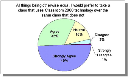 Classroom 2000 has been an ongoing research effort for over 3 years with over 100 classes taught by more than 24 instructors. As a part of our evaluation of the system we distribute a questionnaire at the end of each course taught. To date we have data from nearly 700 students ranging from undergraduate to graduate in courses from Math, Engineering, and Computer Science. Overall, we find that students typically depend on the notes provided, and while they don't feel like it's a substitute for attending class, they are relieved to have the system in place on the occasions when a class must be missed.