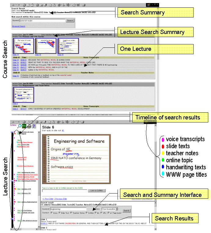 Recording and organizing information is only half of the story. For effective use of the notes students need access to a variety of methods for finding the information they need. This involves being able to extract meaning from information recorded, and providing an interface for searching.