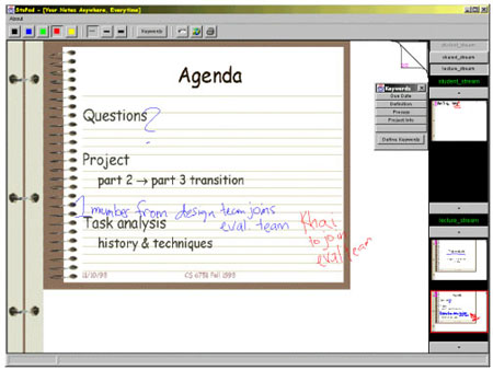 The introduction of student note taking devices is now occurring, allowing the students to augment the public (class) presentation with the integration of their own personal notes