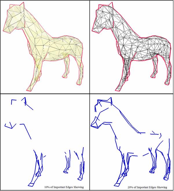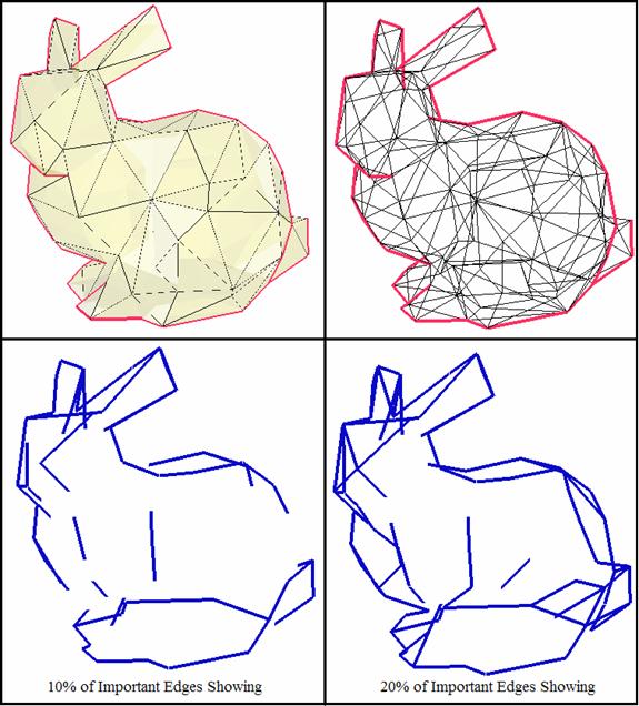 The objective of this project is to draw an image using only its most important edges. The importance of an edge is determined on whether it is a visible silhouette edges based on a certain viewpoint. If multiple viewpoints are used and a certain edge is often seen as a visible silhouette edge (more so than other edges), then that edge is more important than the other edges. By randomly placing many cameras around the image and keeping track of the importance of each edge, the image can then be drawn using only its most important edges.Implementation