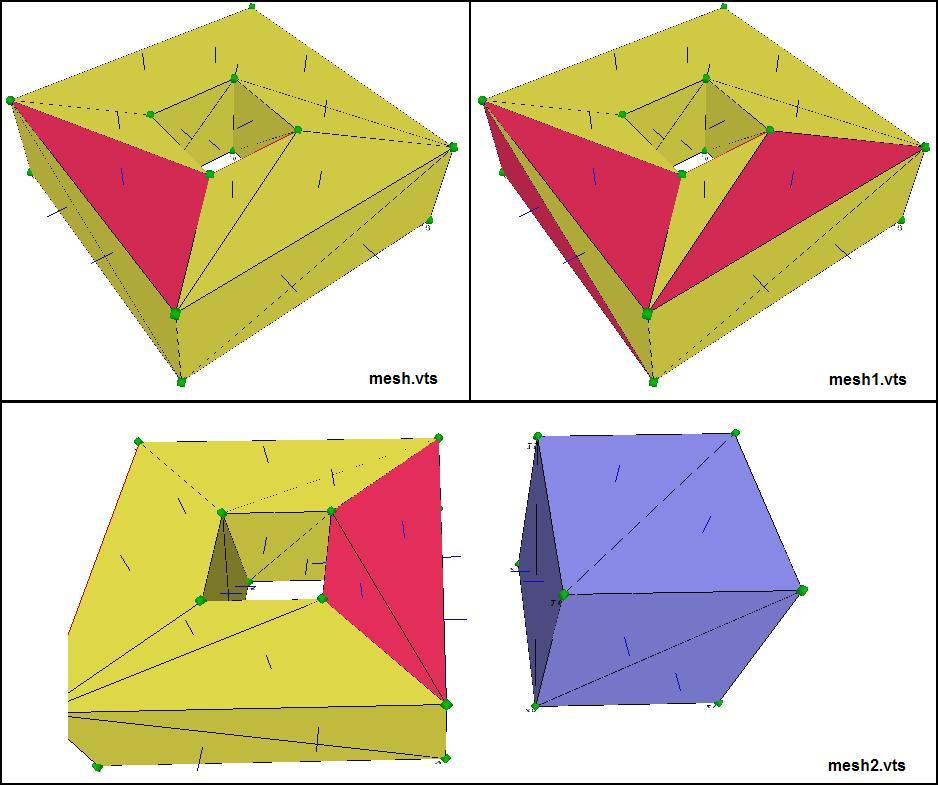 The mesh.vts data file, containing the vertices and triangles for a torus, has the orientation of triangle 0 reversed.The mesh1.vts data file, containing a torus with additional triangles with reversed orientation, has triangles 0, 4, 10, 17, and 29 reversed.