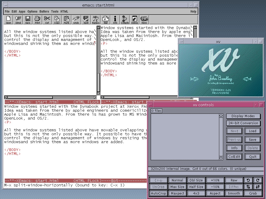 All the window systems listed above have movable overlapping windows, but this is not the only possible way. It possible to have the system control the display and management of windows by resizing the existing windows and shrinking them as more windows are added. Emacs uses this method for giving the user multiple views.
