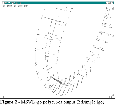 The following example is taken from the sample files that are packaged with MSWLogo version 6.2. This program displays 3-dimensional cubes, polycubes, grid cubes, and other geometric shapes. Notice the use of window message boxes and the 3-dimensional coordinate system which uses the down and up commands. Figure 2 shows the output of one of the procedure calls, polycube.