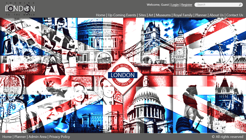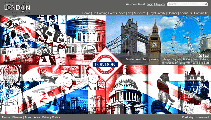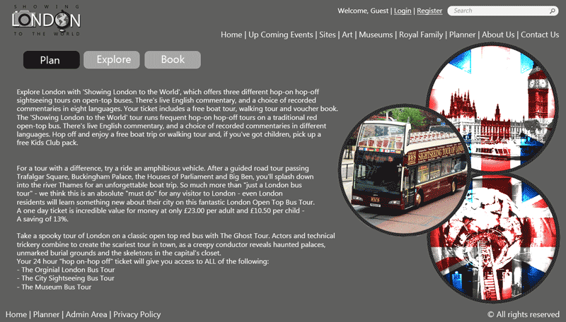 This was one of the four modules in web designing at the World Skills Competition 2011, London. The aim of this module was to design of a web site for the organisation "Showing London to the World" in a specified time of 4.5 hours using specific media and text provided and no access to the internet. The project deliverables included a wireframe, sitemap, palette, logo design and designing the home page and that of a trip planner.