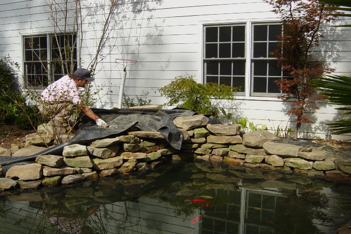 The next step is putting down the black pond liner. Actually, under