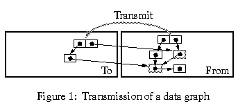 The meaning of transmitting a data graph is the following. Starting from a given root, the graph is copied from the source site to the target site up to the point where mutable nodes or network references are found. Mutable nodes (indicated by shaded boxes) are not copied; in their place, network references to those nodes are generated. Existing network references are transmitted unchanged, without following the reference. Sharing and circularities are preserved.