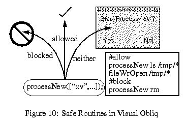 In Obliq, all unsafe operations are readily identified by the fact that they require the use of "access" handles to system resources. For instance a processor handle is needed by routines that create new processes and execute system calls. Similarly there are handles to provide various levels of access to the file-system. The Visual Obliq runtime hides all system handles after having defined a "safe" version of each routine that uses a handle. The safe-routines have the handles bound inside them. An alien program can access a safe-routine but not the handles within it. These routines are considered safe because they compare their op-code and argument list with patterns in a user-specified configuration file (called .vorestrict), to decide which operations are to be allowed and which are to be blocked.
