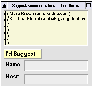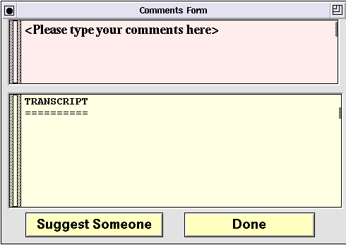 When a user finishes with the questionnaire he clicks on the button labeled "Done" to send the agent on to the next user. The read-only "Transcript" window maintains a log of the input given by each user. When the agent has visited all hosts in its agenda, it will return to the host where it started.The initial list of users and hosts to visit is supplied by the person who starts the application. Subsequently, other users may add to the agenda. Users and hosts are added to the agenda via the Suggest form (Figure 13), which is popped up by clicking on the "Suggest Someone" button (in CommentsForm).