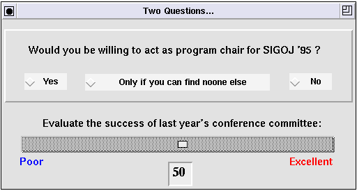 When the button labeled "Done" is clicked, the user's comments and responses (to the questions in SurveyForm[0]) are appended to the editor Transcript. The editor, Comments, contains the user's comments. The answer to the first question is the name of the currently selected choice inside the frame named Qn1. The names of the three choices are Yes, Maybe and No (not shown). The answer to the second question is the text inside the typein field named Qn2. Then the destination host, dest, is computed and the migration command is invoked. If the migration succeeds the loop is exited; otherwise it tries to migrate to the next host.