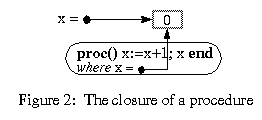 Obliq procedures are first-class data and, like other data, have a value that can be manipulated and transmitted. The value of a procedure is called a closure; it consists of the program text of the procedure, plus a table of values for the global variables of the procedure. Figure 2 shows the closure for a procedure incrementing a global variable x; the variable x denotes a mutable location containing 0. The closure table contains a single entry, indicated by "where x = ...":