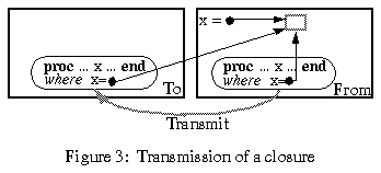 The transmission of a closure (Figure 3) follows the same rules as the transmission of any data graph. When a closure is transmitted, all the program text is copied, since it consists of immutable data. The associated collection of values for free variables is copied according to the general rule. In particular, the locations of global updatable variables are not copied: network references are generated to their location, so that they can be remotely updated.