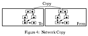 Network copy is useful, for example, when moving a user interface along with a migrating application. A user interface is normally closely bound to site-dependent resources, such as windows and threads. Since these resources cannot migrate, a stand-alone snapshot of the user interface is first assembled. The snapshot consists of some complex data structure, including a representation of the current state of all the live windows of the application. This data structure, resembling the graph in the picture above, can be copied over to the target site, and then converted back to a live interface.