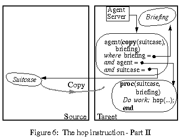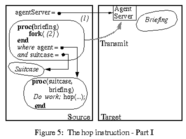 A hop instruction is used by agents to move from one site to the next. This instruction has as parameters an agent server, the code of an agent, and a suitcase. The agent and the suitcase are sent to the agent server for execution.
