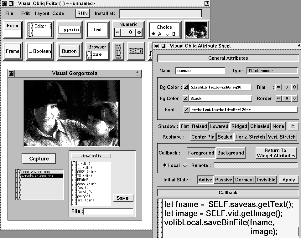 Pressing the `Run' button causes the application to execute within an internal interpreter for testing and debugging. The `Code' menu option provides a facility to output code in Obliq, for stand-alone execution within a Visual Obliq interpreter. We talk more about the interpreter and its special features to support migration in Section 3.3.