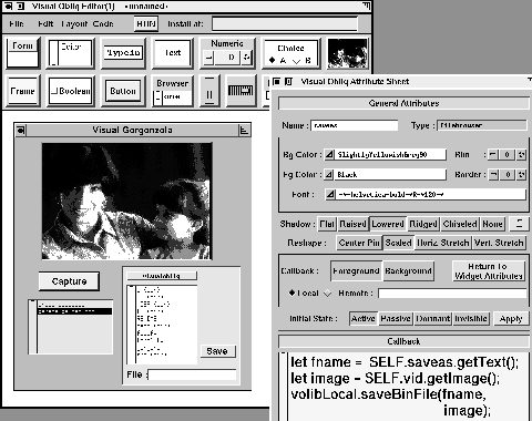 MainWin[...], containing references to instances of MainWin created at run-time. Widgets are implemented as objects nested inside the form instance. Suppose the button labeled `Capture' were named CaptureBtn, the programmer would refer to the button within instance n of MainWin as MainWin[n].CaptureBtn.
