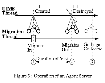 When an application migrates out (step 2), links from the UIMS are broken, and soon its state is garbage-collected (step 3). In this manner, the agent server allows applications to migrate in and out of the host repeatedly, without running out of memory. Multiple applications can co-exist within the interpreter, because they will not have links to each other.