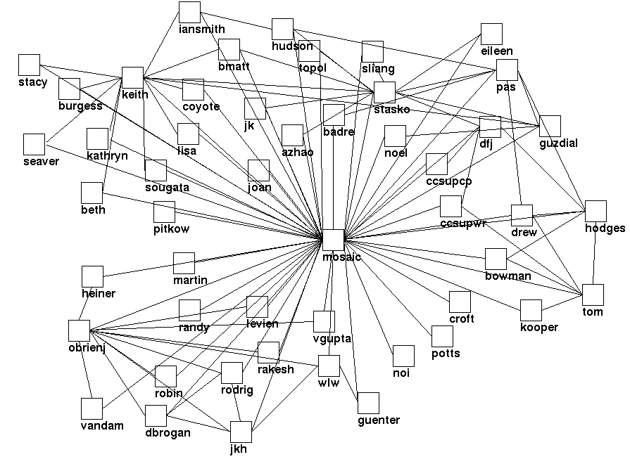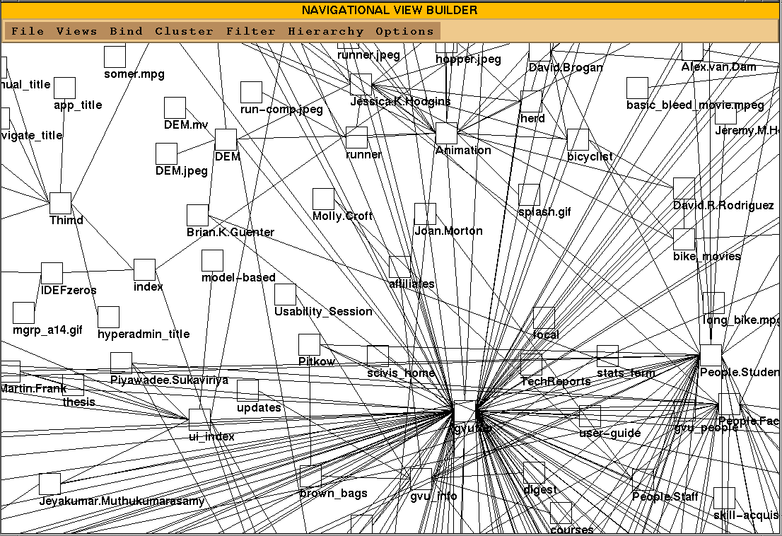Figure 1 shows an unstructured overview diagram of the WWW pages about the research activities at the Graphics Visualization & Usability (GVU) Center at Georgia Tech (URL: http://www.gatech.edu/gvu/gvutop.html). These pages mainly contain information about the faculty, students and research activities of GVU. This figure shows how useless such overview diagrams can be for helping the user understand anything. The whole information space does not fit on a screen, and the interconnections between the nodes make the structure too complex for easy understanding. The figure also does not give any details of the characteristics of the nodes and links. The following sections will describe various strategies to make this diagram more understandable.