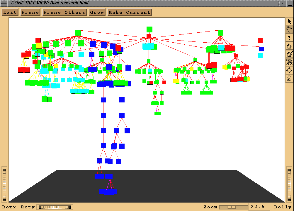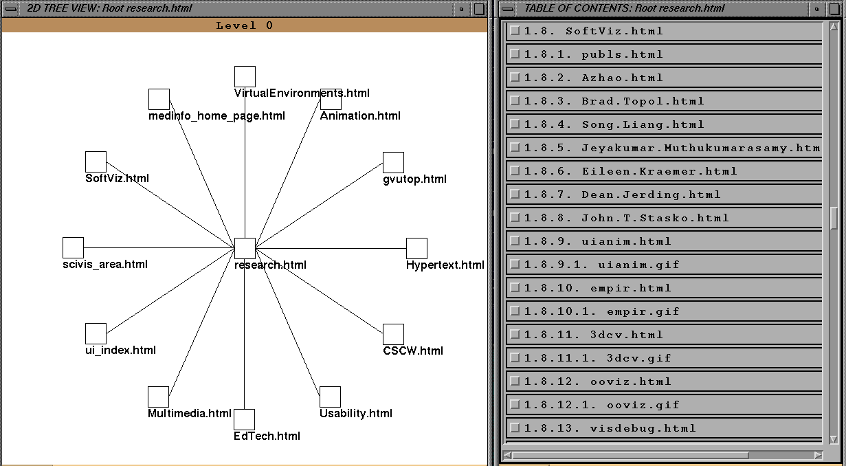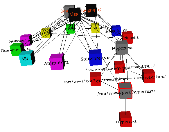 Our algorithm has been implemented in the Navigational View Builder. The left hand screen of Figure 10 shows the top level of the default hierarchy created for the data by our algorithm. The file research.html which lists the various research activities of GVU is the root. It has branches to the major research area as well as to gvutop.html, a file containing general information about GVU. The right hand side of Figure 10 shows a view of a section of this hierarchy (showing research in Software Visualization) where the nodes are listed as a table of content of a book. Figure 11 shows a 3d tree view of this hierarchy. Binding can be used in these views as well. Thus, in this figure the node colors represent author types while the link colors depend on the media type of the destination pages. Also note that the interface allows various zooming, rotating and filtering operations for the 3d tree.