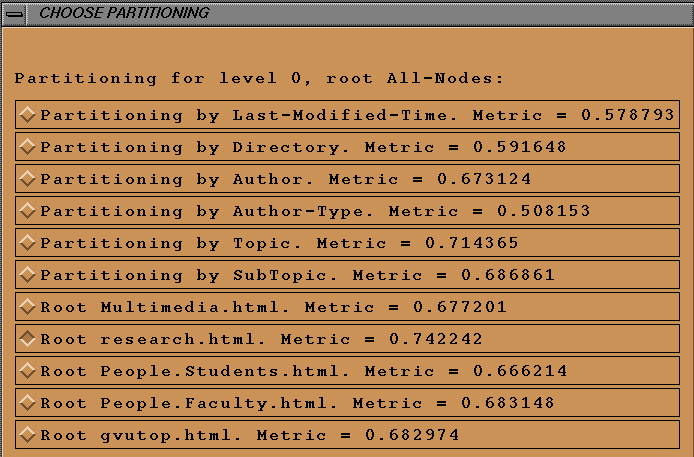 In each step, our hierarchization algorithm tries to identify a root and partition the other nodes of the graph into different branches. These branches are themselves graphs and the algorithm is recursively called for each branch. At each step various partitions are possible based on structural and content analysis. A metric is used to rank these. By default the partitioning with the best metric is chosen and thus, the algorithm forms a hierarchy automatically. However, the user can guide the hierarchization process. Various choices for forming partitions can be shown in a menu as shown in Figure 12 and the user can choose any one. Details of the algorithm is presented in [7].