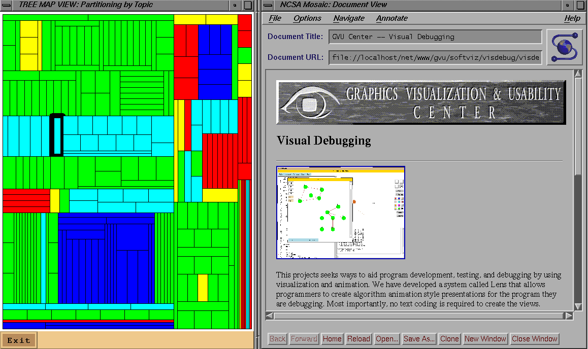 The left hand screen of Figure 13 shows a Treemap view of a hierarchy that was formed with the attribute topic being used to initially partition the nodes. Here also colors are used to represent author-type. In this way, multiple hierarchies, each giving a different perspective to the underlying information space can be formed. If a user selects a node in one view, its positions in other views are also highlighted. Thus, these views help the user in comprehending the data. It should be also noted that the user can go directly to the corresponding WWW page for the selected node. Thus in the Treemap view the node visdebug.html is highlighted. The corresponding WWW page is shown on the right hand screen of Figure 13.