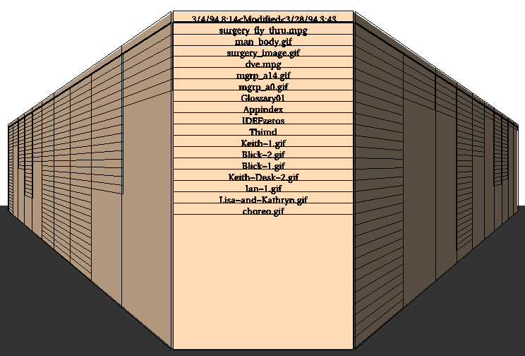 Once a hierarchy is formed from the original graph structure, other views can be developed as well. For example, if the original partitioning for forming the hierarchy was done by a quantitative attribute, a linear structure sorted by that attribute can be formed from the subtrees of the root node. For example, Figure 14 represents a perspective wall [4] view of a linear structure sorted by the last-modified-time. From the hierarchy whose initial partitioning was by the attribute last-modified-time, the files were divided into partitions based on the time when they were last modified. These partitions were arranged on walls. Only some walls are in the focus at a given time. The user can easily control the walls which are in focus through a scrollbar. Similarly a tabular view showing useful statistics for the various pages and also for groups of pages organized by topic can be formed by a depth-first traversal of the hierarchical structure whose initial partitioning is done by the attribute topic.