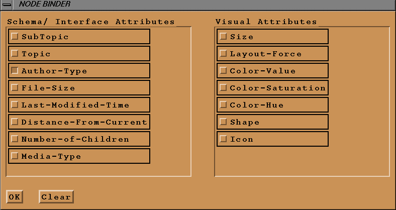 The designer of the overview diagrams should be able to specify the bindings between the information attributes and the visual attributes of the nodes and links. These bindings specify a mapping between the information space and the visual space of the hypermedia system. At the time of displaying the navigational views, these bindings and the information in the underlying information space control the actual appearance of the views. For example, if the topic is bound to the color of the nodes, the color of the nodes in the view would be controlled by the topic of the page which the node represents. Unfortunately, the number of visual properties that can be used to depict information is usually less than the amount of information in the underlying database. Therefore, only the important data attributes should be bound to the visual properties. Thus, the mapping between the database and the visual attributes should not be hardwired into the system since the importance of the data attributes cannot be fixed a-priori. The Navigational View Builder allows the designer of the navigational views to specify the bindings between the data and the visual attributes of the nodes and links in an easy-to-use interface. A sample interface for binding node attributes is shown in Figure 2.