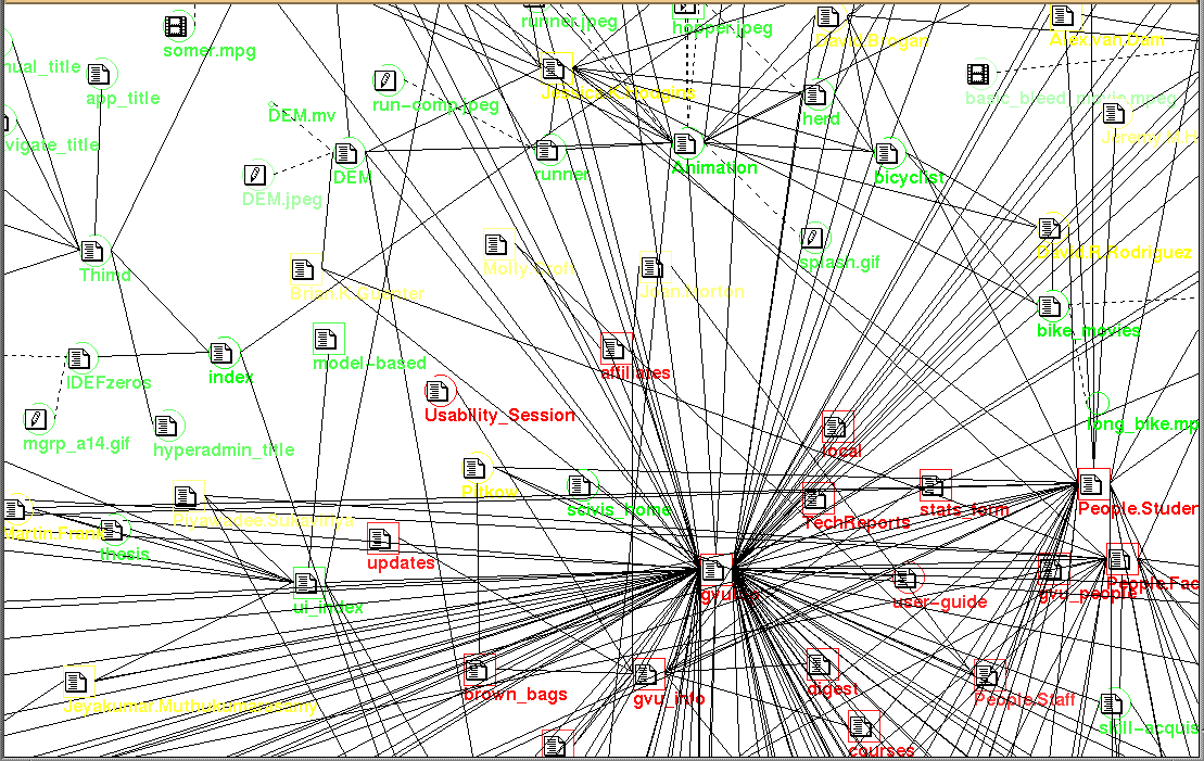 Figure 3 shows an example of a view of the GVU WWW pages with various visual properties bound to information attributes. In this example icons are used to represent various media types, the node size is bound to the file size (inversely) while the shape represents whether the author of the page was a student (circles represent students). The color hue represents the topic of the page while the color saturation represents the last modified time. Moreover, links connecting two html files are solid while links connecting html files to other kind of files are dashed. More information is presented to the user in this diagram than in Figure 1. A more detailed discussion of our binding strategy and its usefulness is presented in [5].