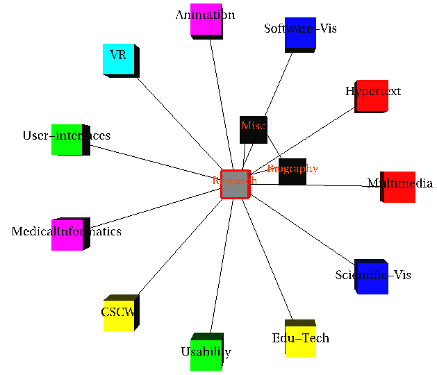 For example, Figure 6 shows a view where the user wanted to see the details of the Research pages. The x-y plane is used for showing the details of each particular layer and the layers are arranged in the z dimension with the most detailed view (of the Research pages) in the front. It can be argued that as more and more details are available, the context would move deeper and deeper into the screen. However, the eye-point can be shifted to bring different parts of the space in focus. For example, besides the front view, back, side and top views can also be provided. Figure 7 shows a top view of the information space after the user wanted to see details of the Hypertext research area. (Note that colors are used to represent different research areas and the nodes whose details are being shown are greyed out). We allow smooth animation so that the view changes are not abrupt and allows the user to see the changes easily. This view shows that the details of the user's interest as well as the context are integrated together on a single screen. (However, it should be noted that the user can generally see the details of one part of the space only - otherwise the view becomes very confusing).