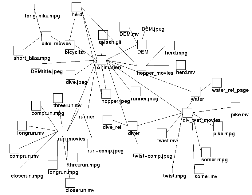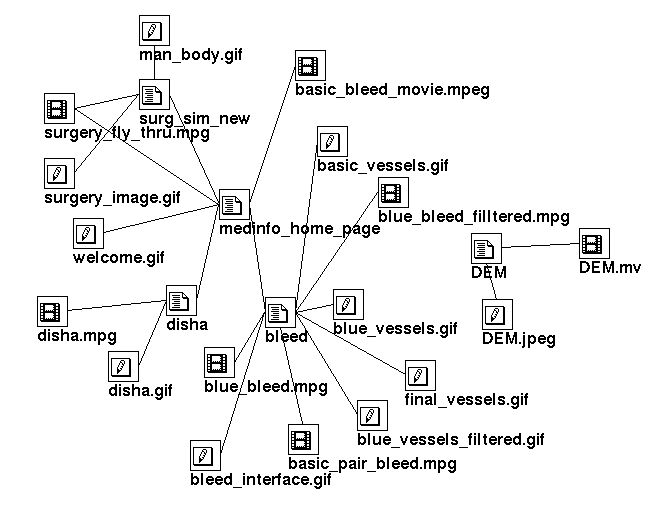 3. Structure-based: Suppose some organizations have guidelines for their employees when they are making their WWW home pages. It may state that a central html page should be linked to a gif file and another html page. Later on, an administrator for these pages may wish to check whether people have been following the guidelines. Traditional content-based database querying would not be of much help. Therefore we allow structure-based querying which allows the showing/hiding of certain subgraph patterns only. For example, Figure 9 shows the html pages that are linked to both gif files and movies. (Icons represent the media types of the pages).