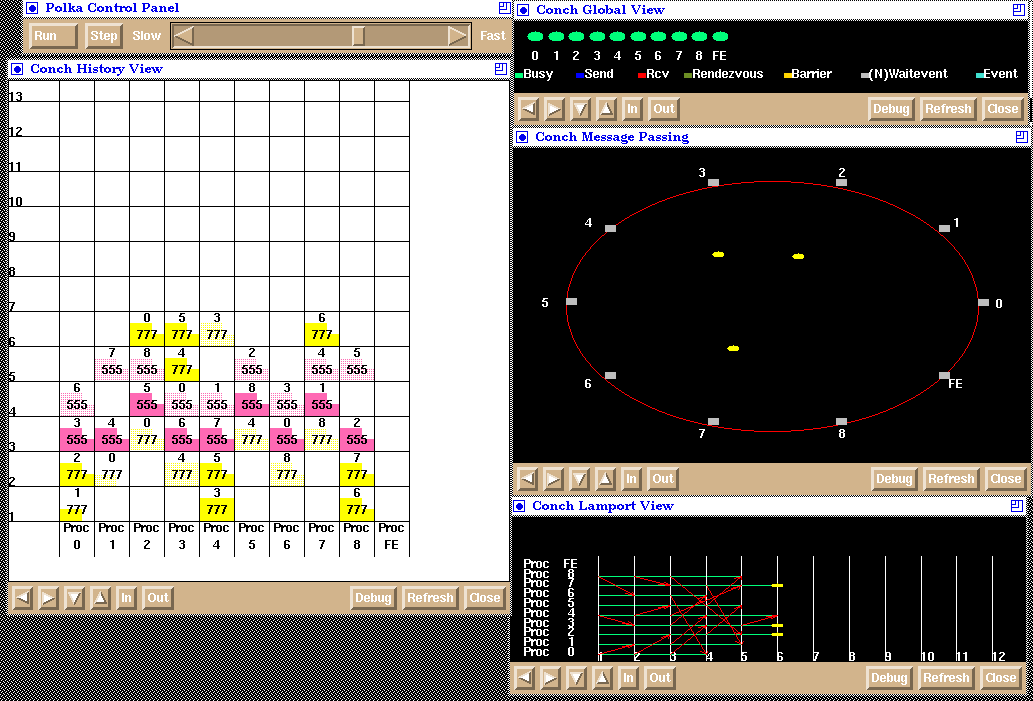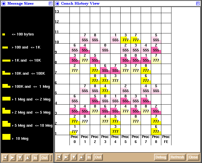 The Conch History view is a scrolling view that maintains a history of messages that have been sent or received. The Y-axis of this view is labeled with Lamport clock values with time proceeding from bottom to top. The X-axis is labeled with process identifiers. Squares that are associated with message sends are filled in with dark colors. Lighter colors of the same hue fill squares that are associated with the corresponding message receives. Message size is encoded by filling squares with various amounts of color. This can be deciphered by using the message size view, shown to the left of the history view. Referring back to the history view, the message type is placed in the lower center of each square. The number in the top center of each square can represent two different items of information. If the square represents a message send, then this number denotes the process identifier to whom the message is sent. In squares associated with message receives, this number depicts the process identifier from which the message was received.