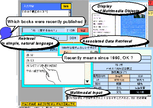 The goal of the interface is to realize associated data retrieval that understands natural language and multimodal dialogue [7]. It is intended not only for the novice computer and library user, but also for expert users. Toward this goal, this interface has three features: (1) Japanese query understanding, (2) multimodal input understanding, (3) associated data retrieval using various relationships.