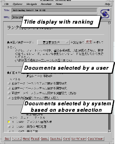 Based on WWW based interface, work on relevance feedback interface [22,23,24] has been proposed where the effective relevance feedback algorithm is based on a vector model. We extended the method to calculate the weight of each keyword using value length parameters and column type paramenters.``Information Visualizer'' [17,18] proposed various visualization methods of hierarchical structure information, reference information, and complex information. Our WWW based interface proposed a method to select axes automatically through visualizing on a graph. [19] and [20] proposed a method where persons that have close preferences exchange information; it is based on filling out a questionnaire. In our virtual stacks, a user can freely arrange the books that the user selected on virtual personal bookshelf. Another user that has close preferences can get the desired documents using the user's virtual personal bookshelf. In this way, we can implement one of the social filtering methods.