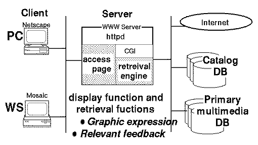 (1) The WWW architecture has the following three features suitable for a digital library. (a) without installing another new browser, anyone can use the service with a WWW browser, which has become popular throughout the world in recent years. (b) The WWW server can distribute various kinds of multimedia data and the WWW browser can display it. (c) It is very easy to construct an original database service with an individual retrieval engine through CGI.