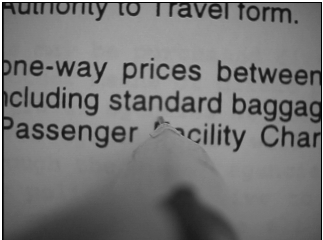 Compared with those systems, the major advantage of PaperLink is that it can operate on the actual content of paper objects. It can capture enough details of the words or marks a user is pointing to (with a normal resolution camera, and without a registration process) to allow them to be used reliably as input. On the other hand, because VideoPen only captures a very small area at a time the PaperLink system cannot make use of document context, and it is hard to know what is happening in a large area such as a desktop. Consequently, this system is complementary to coarser grained approaches described above.