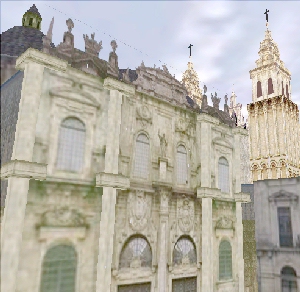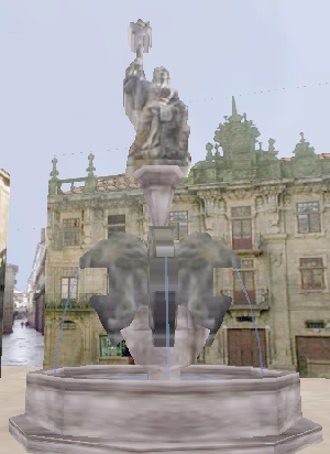 The inaugural project for the NAVE is Santiago 2000, a collaborative effort between Georgia Tech's Virtual Environments Group and the Technological Research Institute of the University of Santiago de Compostela. Santiago de Compostela (Spain) has since the early middle-ages been one of the first, and most important pilgrimage sites for the Christian world. It is said to house the remains of the Apostle Saint James, brought from Palestine after his death in 42 A.D. Since 1120 A.D., Santiago has enjoyed special privilege, first granted by Pope Calixto II in a Papal Bull (Registerna). On the years where the day of Saint James (July 25th) falls on a Sunday, those who visit the Cathedral will be granted the same graces as those attained in Rome. The millenium´s final Xacobean year occurs in 1999. Santiago has additional reason to celebrate, as it has been chosen to be one of nine cultural capitals of the European Union for the year 2000.To celebrate these two events, along with the general euphoria of the new millennium, the Santiago 2000 Project will produce a virtual environment that recreates the Plaza de Obradoiros in Santiago in addition to several other areas surrounding this main plaza. The environment will include detailed visual models of the squares. Furthermore, visitors will hear the church bells, bagpipes, conversations and singing troubadours as they stroll through the city. Santiago 2000 demonstrates that a PC-based system can support real-time, high quality, large-screen, stereoscopic imagery.